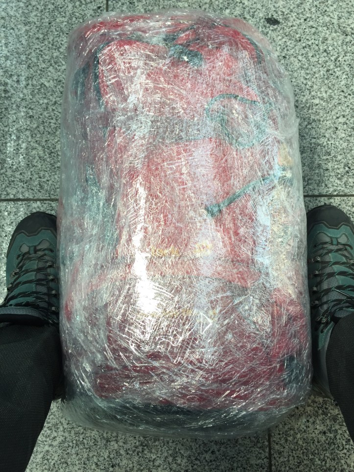 Im Flughafengebäude angekommen, wickel ich meinen Rucksack zigfach in unsere Superstretchfolie von der Arbeit: