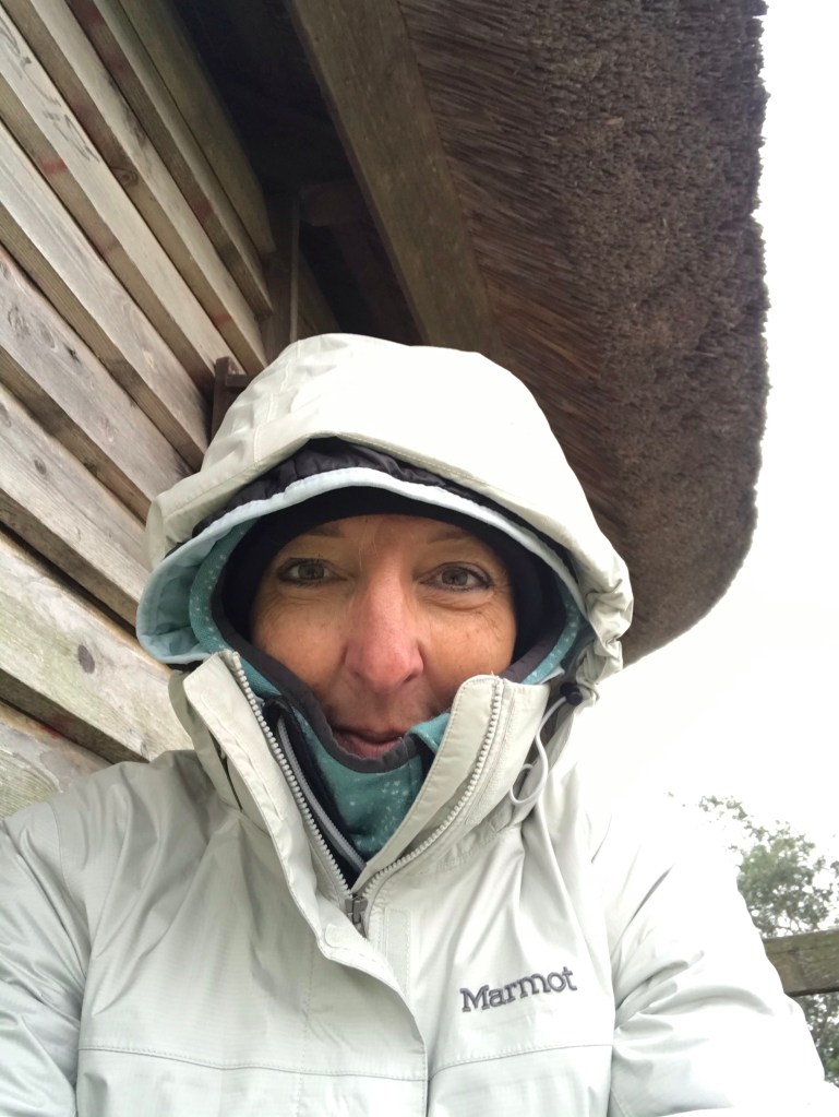 Bis Zingst keine Menschsenseele, dort dafür um so mehr. Schnell weg. Ich sage dem Meer adieu, denn hier biege ich nun landeinwärts ab. Jetzt kommt der Sturm zurück und bringt leider auch Regen mit, der nicht angesagt war. Von jetzt auf gleich ist es gefühlt 10 Grad kälter. Zum Glück finde ich Schutz unter einem Reetdach. Alte Regel für Reetdächer: Nicht nach oben gucken 😆