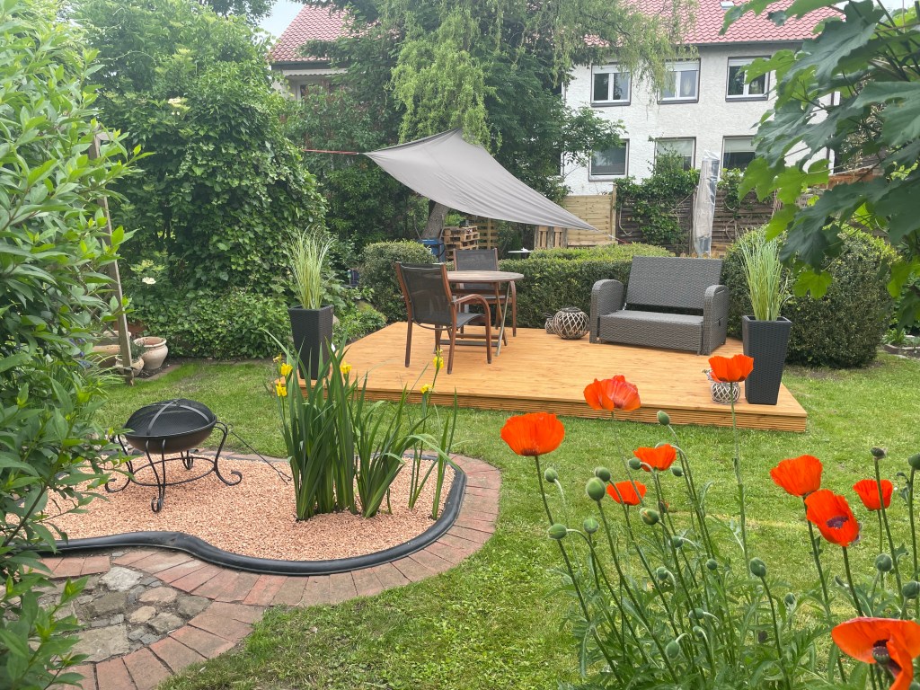 Ich sitze auf meiner Terrasse und freue mich wahnsinnig über dieses Ding. Hier noch mal ein Updatebild mit Feuerstelle.