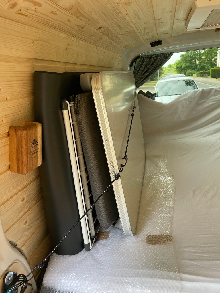 Oh man, was war das denn heute?! Großer Packtag sollte heute werden. Alles mal da hin räumen, wo es hin soll und die Zwischenräume mit Luxus füllen. So war der Plan. Es kam aber anders. Tisch, Stuhl und Wäscheständer passen nicht unters Bett, ich muss sie also im Innenraum verstauen. Dafür gibt es nur einen Platz: Die freie Wand. Das passt auch alles super, nur mit der Befestigung ist es schwierig. Die erste Probefahrt kracht nach 20 Metern zusammen.