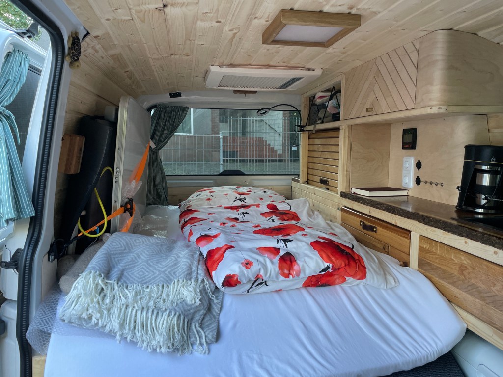 So sieht es übrigens in meinem Bulli aus, wenn ich nicht auspacke, also über Nacht nur kurz irgendwo stehe und am nächsten Morgen weiterfahre.