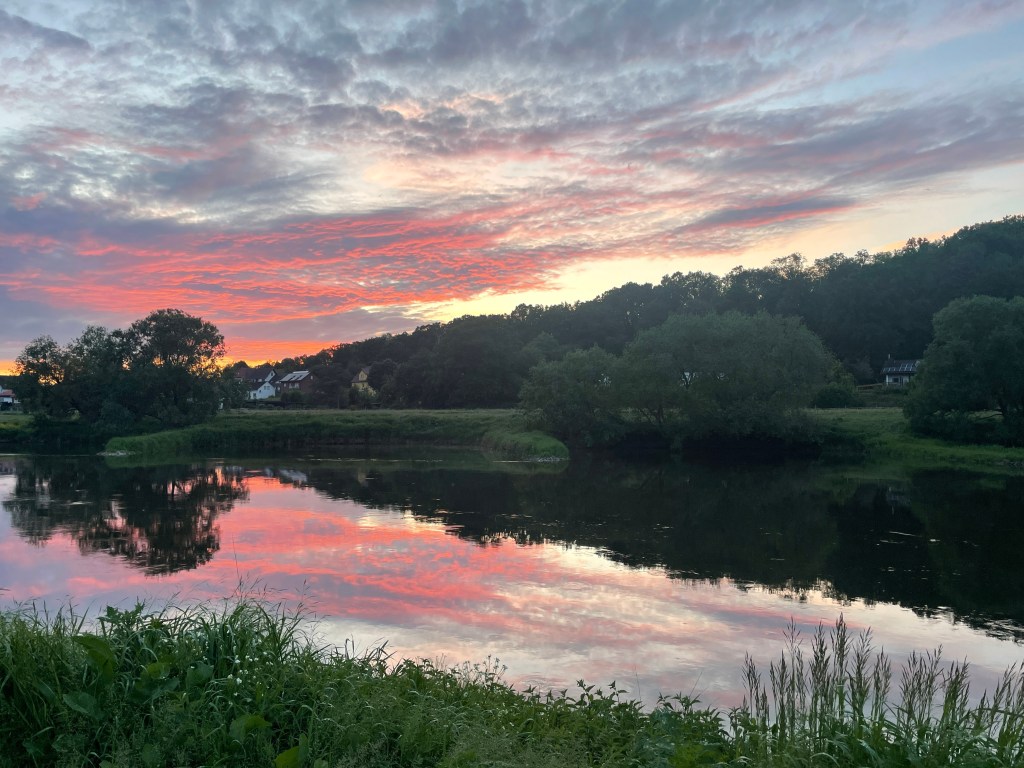 Wir sitzen gemütlich in einem Biergarten an der Weser, als plötzlich und ohne Vorankündigung die Welt untergeht. Die einsetzende Dunkelheit und die Schließzeit der Rehaklinik beenden unseren Abend. Mein Heimweg, dieses Mal am Fluss entlang, ist wunderschön.