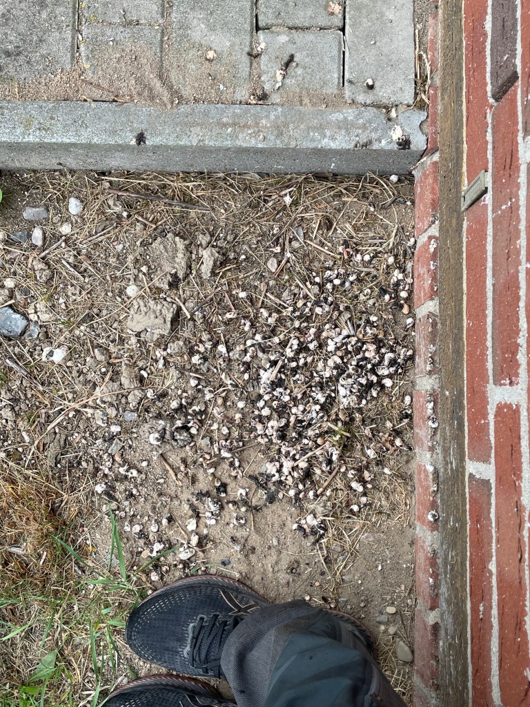 Regenpause Nummer zwei, nur ein Dach gefunden. Hoffentlich scheißen mir die Schwalben nicht auf den Kopf.