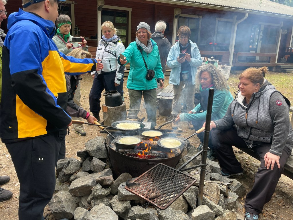 Wer ist hier überhaupt? Also grundsätzlich würde ich sagen „Geld ist da“, sonst reist man vermutlich nicht nach Finnland und auch nicht mit Wikinger. Die Hälfte sind Paare (7), die Hälfte sind Singles (6). Wobei alle Singles Frauen sind. Das Altersspektrum reicht von 30 bis 70, obwohl 30 ist nur ein Paar, danach kommt Silke mit 45 und ich mit 48. Die meisten sind tatsächlich wegen der Kombi aus Essen, Wandern und Skandinavien-Affinität hier.