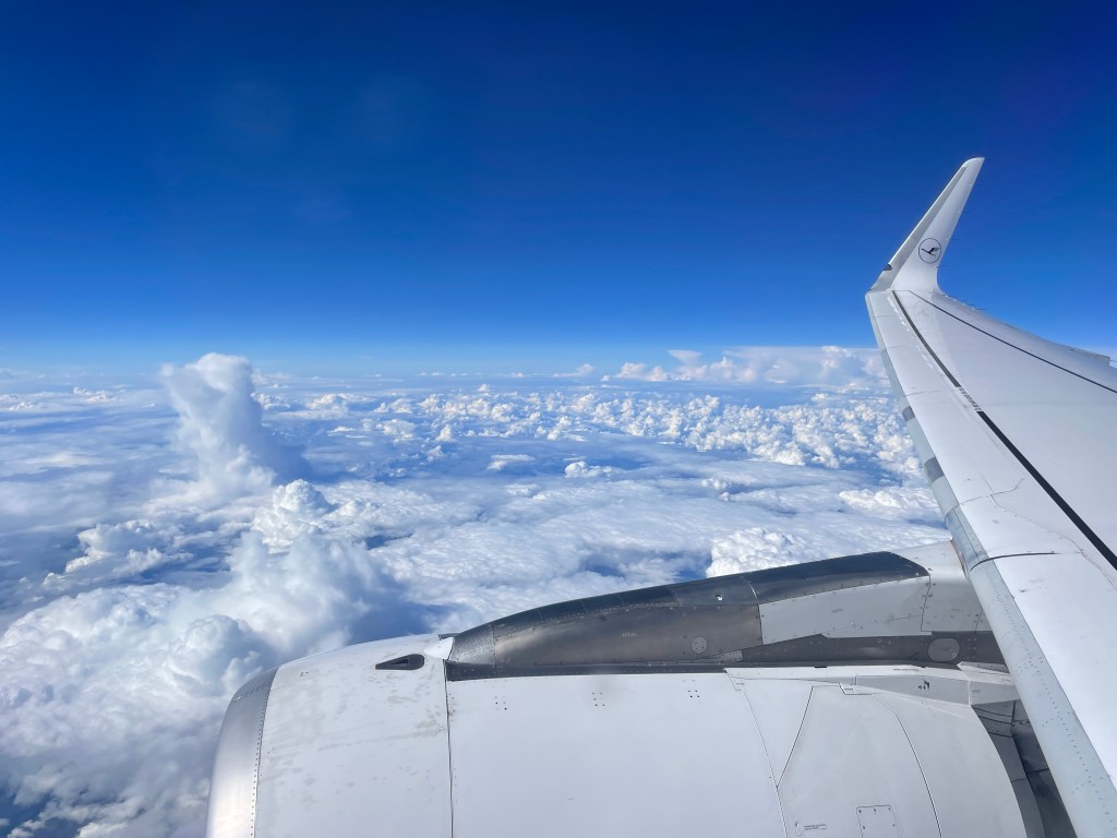 Alles pünktlich, erste Hürde des Tages: Ich sitze mitten in einer pubertierenden Schulklasse mit einem Geräuschpegel deutlich über dem Airbus. Die Lehnen werden runtergedreht, alle Knöpfe gedrückt, alle Plätze durchgetauscht, es ist wie im Irrenhaus. Und kein Mensch sagt irgendwas. Weder die Lehrer noch das Flugpersonal. Was zur Hölle macht überhaupt eine Schulklasse an einem Samstag auf einem Lufthansaflug?