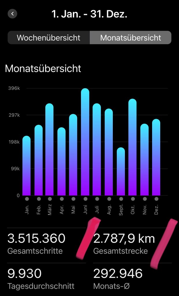 Am meisten beeindruckt haben mich deine gelaufenen Kilometer. Ist das wirklich wahr? Da sind doch alle anderen verfehlten Ziele egal! 👍😄