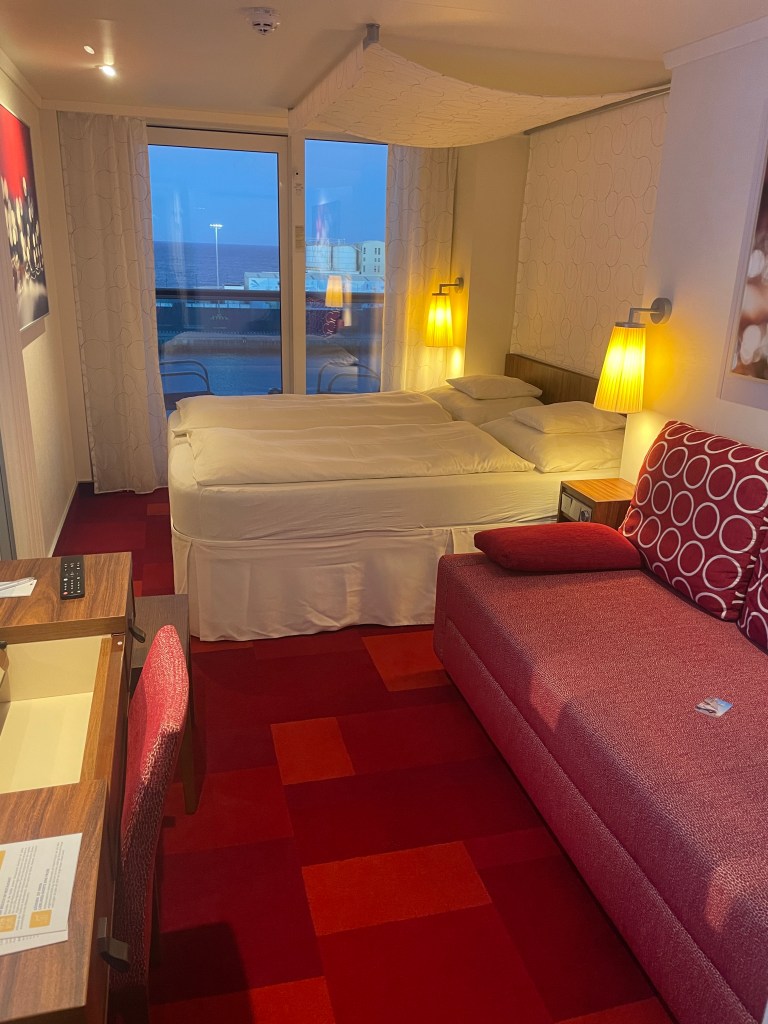 Nach Sicherheitskontrolle und Check-Inn muss ich erst noch zur Sicherheitseinweisung. Danach öffne ich meine Kabinentür und finde ein wirklich geräumiges Zimmer, viel größer als erwartet: