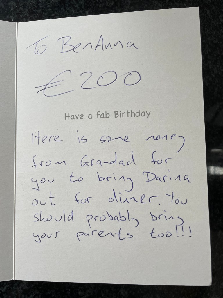 Paddy, der Vater von Jason und Stephen, hat Geld geschickt, damit wir Essen gehen und uns einen schönen Abend auf seine Kosten machen können. Ich heule auf der Stelle. Unfassbar lieb und unfassbar großzügig.