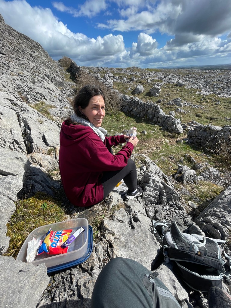 Nevertheless, Jessica and I drive into the Burren at noon and climb Mullaghmore. Having summit picnic with wraps and tea: