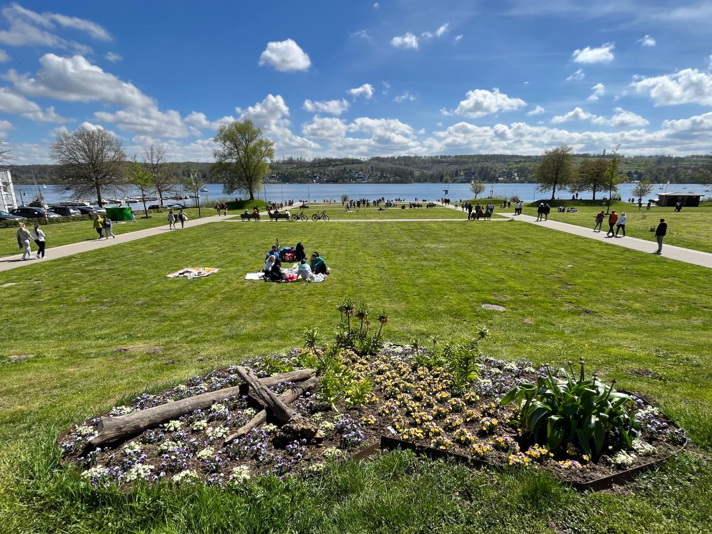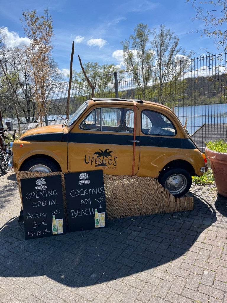 Wir haben nicht nur Glück mit dem Sonnenschein, dem See und uns, sondern auf der Suche nach einem Eis straucheln wir in eine Beachbar-Eröffnung!