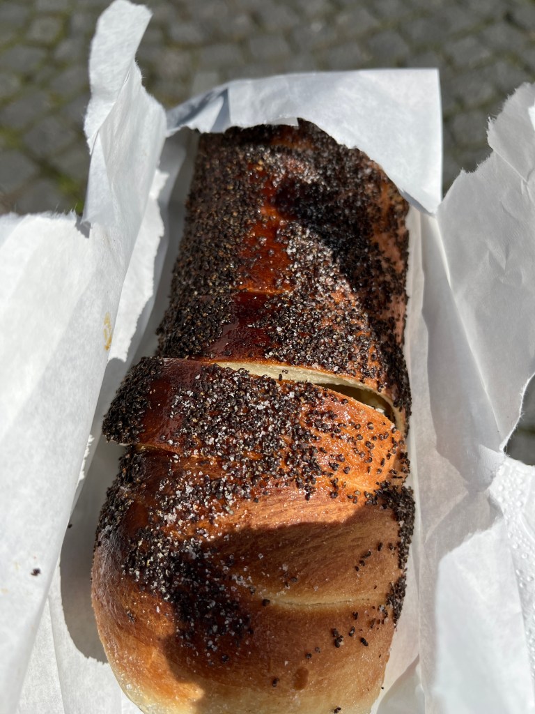 Frischen Baumstriezel mit Mohn. Gibt es bei uns nur am Weihnachtsmarkt. Hier für 6 Euro auch unterjährig. Und dafür auch mit Zewa statt Serviette. Hätte wahrscheinlich sonst 7 Euro gekostet. Ich meine, hochgerechnet auf 3 Millionen…