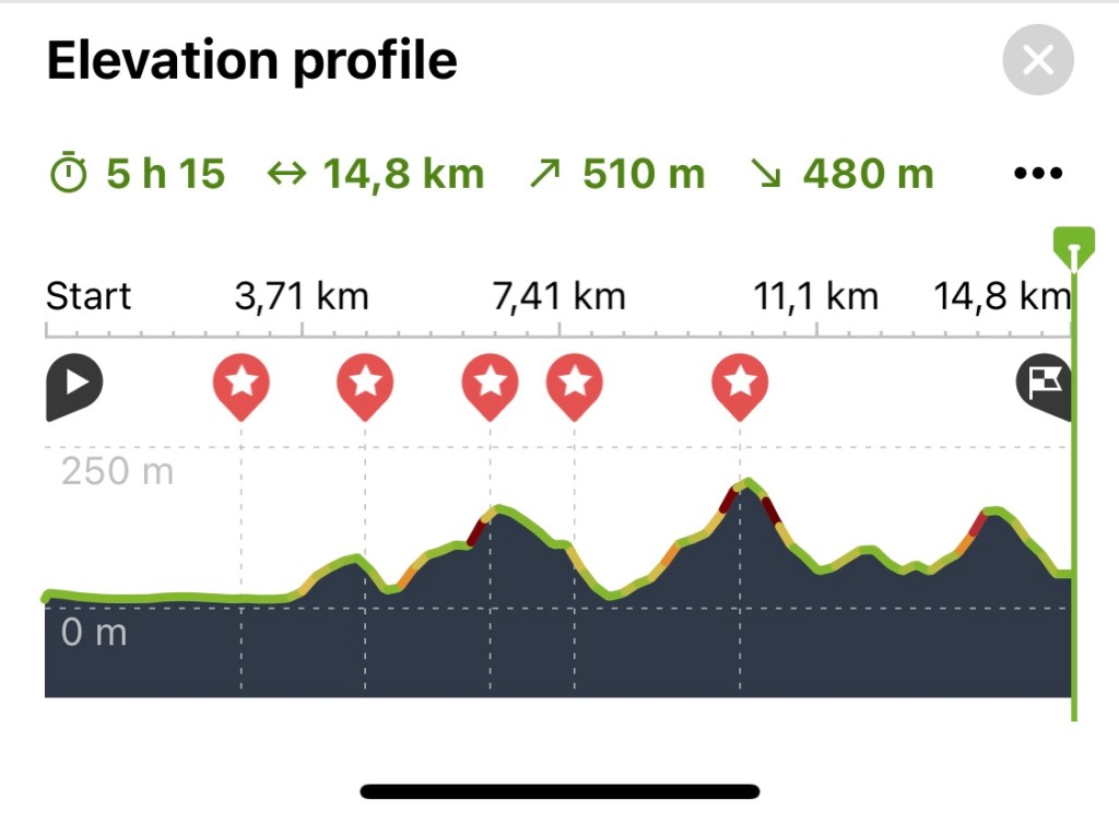 Bei genauerer Betrachtung des Höhenprofils fällt mir auf, dass es hellrot und dunkelrot gibt. (Weil ich mich ja gerade darüber beschwert habe, dass es kein Lila gibt.) Auf jeden Fall sehen wir auch hier rote Punkte… Ein Mal hell, drei Mal dunkel.