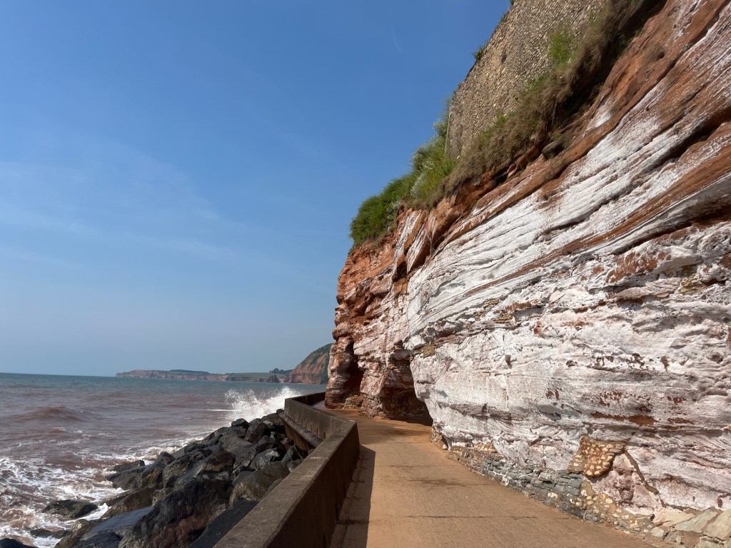 Da ich ja nun weiß, wie es um das Essen in Exmouth bestellt ist, lunche ich in Budleigh Salterton am Strand. Zwei ältere Damen setzen sich dazu und essen Eis. Ich hole mir auch eins zum Nachtisch, weil sie davon schwärmen, wie gut es ist. Dann tropft was davon auf meine Shorts, ich fluche, entschuldige mich gleichzeitig und sage „Ich hab halt nur die“. Eis ist in Südengland eine Spezialität, von der du keinen Zuckerrand auf der Hose behältst, sondern einen Fettfleck.