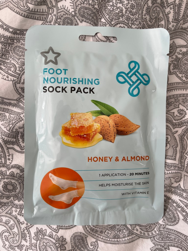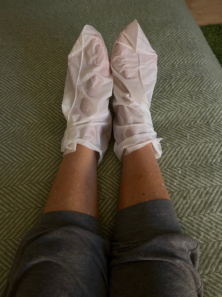 I am strolling through a huge drug store and decide to have a little spa day. The funniest thing I find is a foot mask.