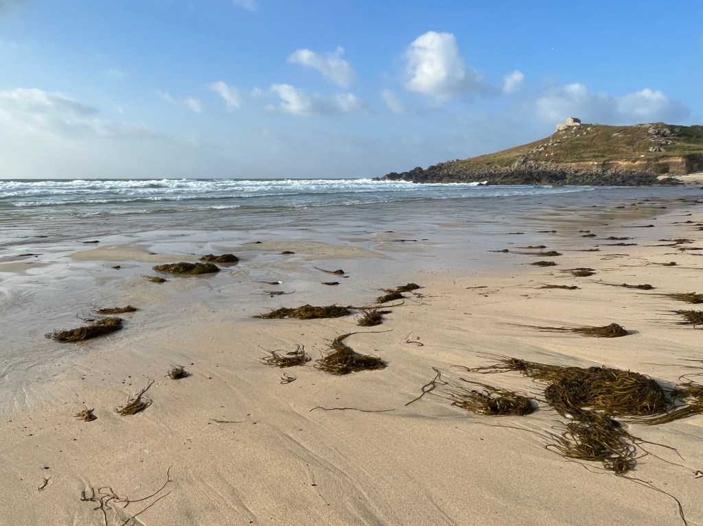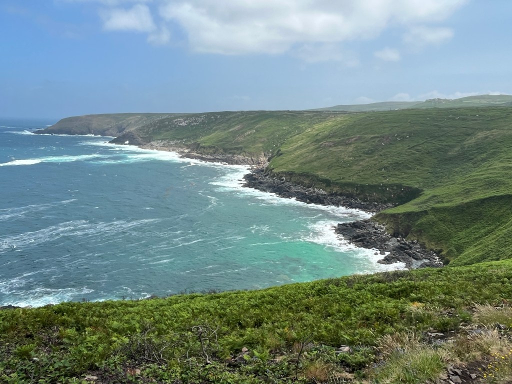 Mit dieser Aussicht mache ich Mittag, da kommen zwei Männer den Berg rauf. Ich frage, ob sie in St. Ives gestartet sind. Ja, sind sie, Wie lange sie bis hier gebraucht haben, frage ich weiter. Dreieinhalb Stunden ohne Pause. Damit ist für mich klar, das schaffe ich nicht. Also Landeinwärtsstrategie.