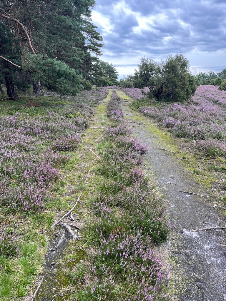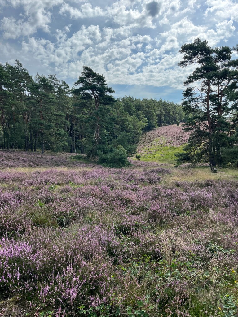 Am Morgen schiebe ich die Bullitür auf und genieße mein Frühstück immer noch in aller Ruhe. Auch akustisch. Dann Turnschuhe an und auf gehts… Die Heide blüht, Hermann Löns lässt grüßen.