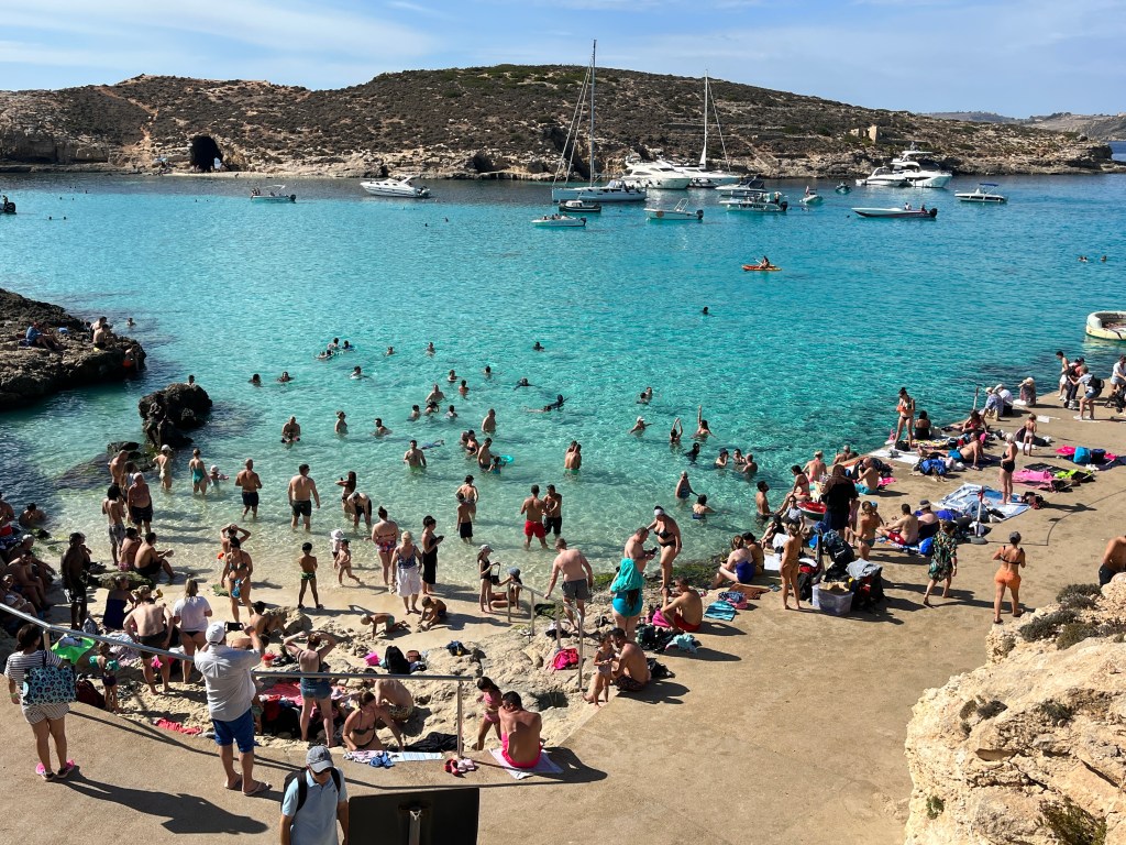 Früh geht es los, denn die Temperaturen wollen einfach nicht fallen. Mit einem eigenen Boot werden wir auf die 3,5 Quadratkilometer große Insel Comino (Kümmel) gebracht.