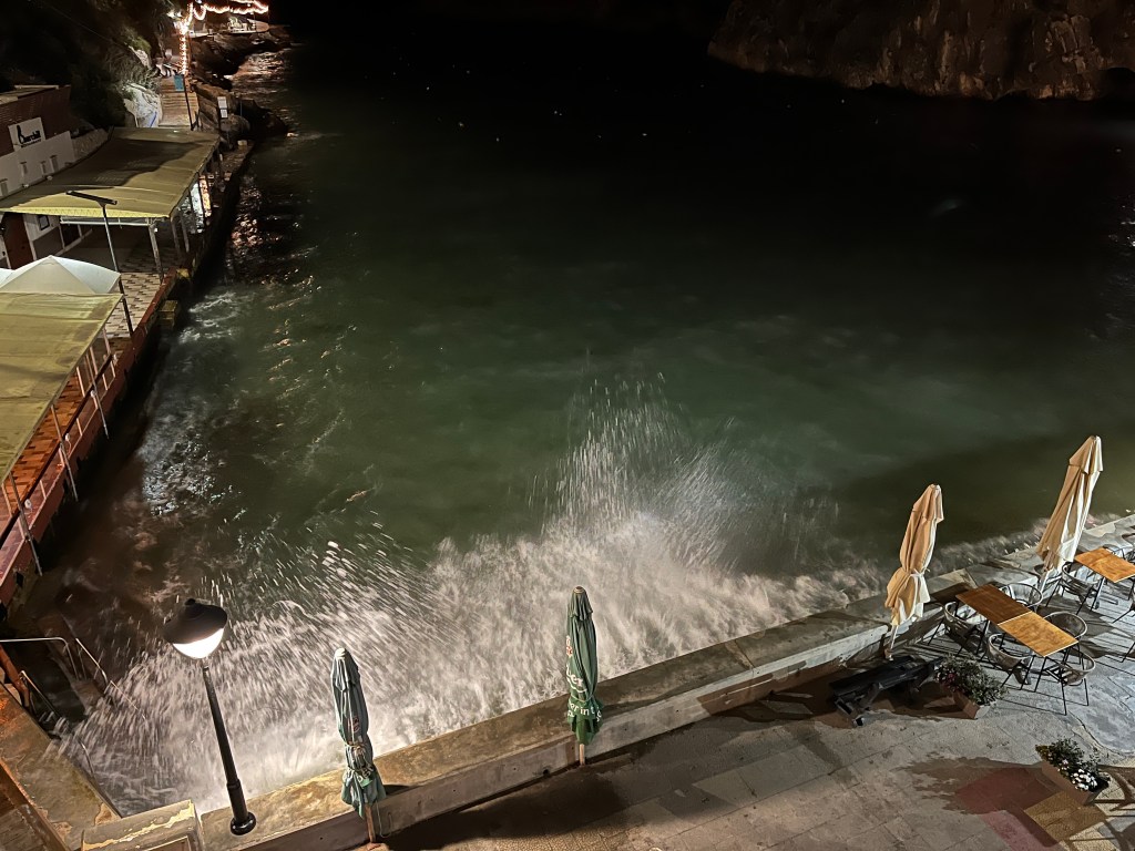 Zum Glück hat es sich ab frühem Mittag zugezogen. Dann kam der angekündigte Wind. Wobei „Wind“ nicht ganz die richtige Formulierung ist… Das Meer eskaliert, die Fähre kann ja lustig werden morgen.