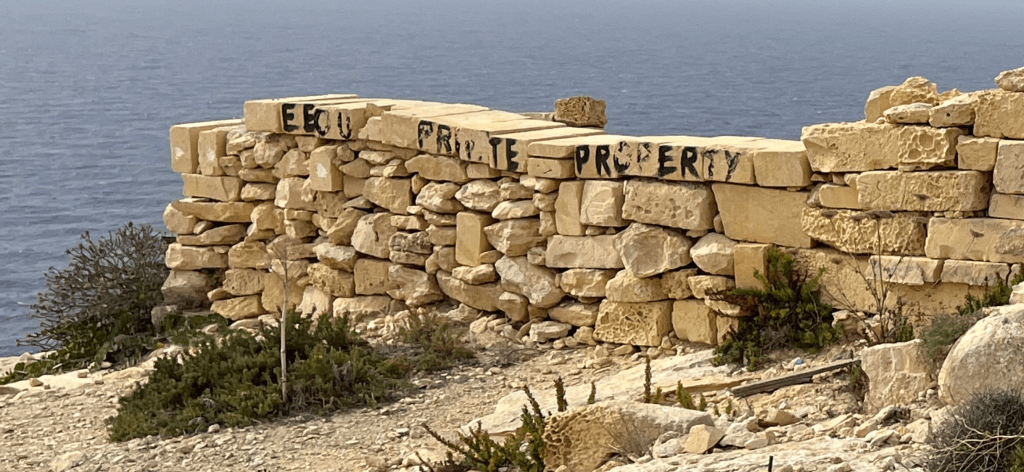 Auf Gozo ist es mit den Vogeljägern noch viel krasser. Ich würde sagen, 80% des Küstenweges sind annektiert. Stein nehmen, „private“ dranschreiben, schon ist es deins. Wagt es jemand, das zu betreten, wird warnend in die Luft geballert oder zumindest durchbeleidigt. Alleine wäre ich hier nicht einen Meter gewandert.