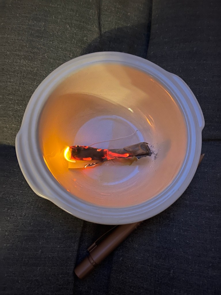 So bestand mein persönliches Ritual der letzten 12 Tage darin, das Kapitel des Tages zu lesen, über die Fragen nachzudenken und das Thema 24 Stunden bewusst mit sich zu tragen. Beispiele sind Im Körper ankommen, In die Intuition vertrauen, In Freude und Leichtigkeit sein, Liebe zu dir selbst, usw. Die reine Lesezeit schätze ich auf unter 15 Minuten, das schaffen also auch Berufstätige 😉 Dann habe ich in Stille meditiert, anschließend eine Karte gezogen, die mir als Wegweiser für die nächsten 12 Monate dienen soll, denn jede Nacht steht für einen Monat in diesem Jahr. Zum Schluss habe ich ein Röllchen aus meinem Körbchen gezogen, es verbrannt und die Asche aus meinem Fenster zurück ins Universum befördert. Am letzten Tag bleibt ein Wunsch übrig, um den muss man sich selbst kümmern, den Rest übernimmt das Schicksal.