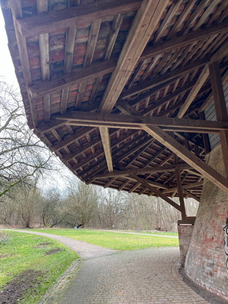 Hier steht ein denkmalgeschützter und toll restaurierter Kalkofen samt Schornstein von 1925. Hierher lohnt sich ganz sicher nochmal ein Besuch im April, denn der Park ist voller Obstbäume.