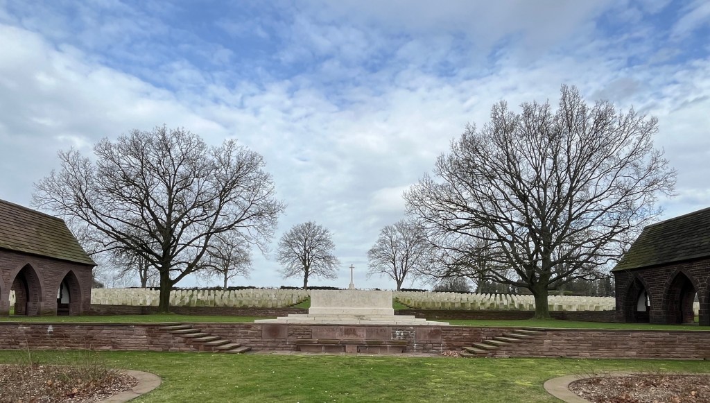 Gleich benachbart ist der englische Soldatenfriedhof, auf dem knapp 2.500 Menschen ihre letzte Ruhestätte fanden.