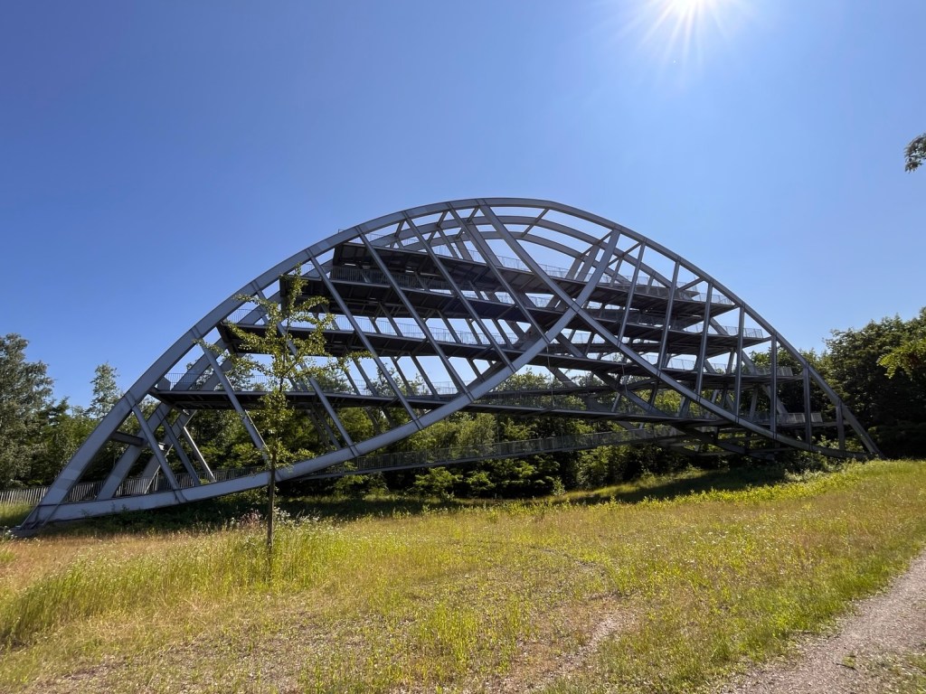 Irgendwann nimmt die Temperatur dann doch Fahrt auf: Liege, lesen, die Sonne genießen. Die Geschwindigkeit muss ja auch mal runter. Und außerdem will ich mich ein bisschen ausruhen, denn morgen steht der Goliath von Sachsen-Anhalt auf dem Programm: Der große Goitzschesee. Das ist auch der Grund, warum ich in Bitterfeld gelandet bin. Nicht gerade das beste Pflaster, aber der einzige Campingplatz. Ein Hauch von Polen und Arabien, alten Umweltsünden und dem Versuch, es besser zu machen. Als Symbol für den Wandel gibt es den Bitterfelder Bogen. Natürlich mit freundlicher Unterstützung der EU.