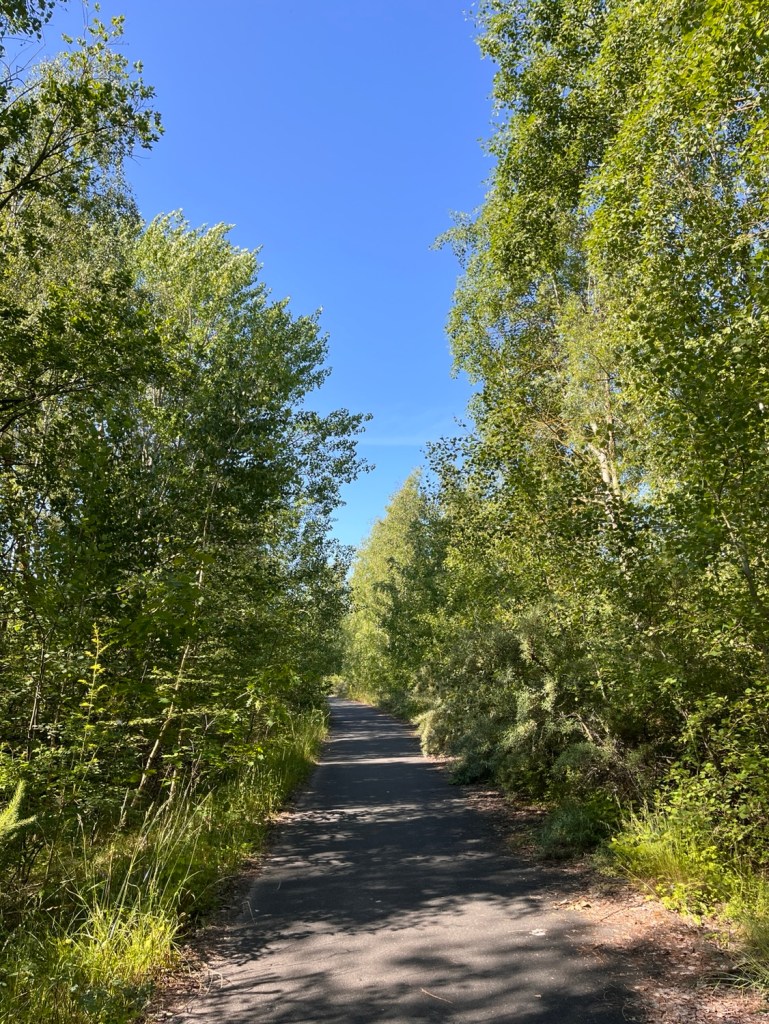 Um 10:30 Uhr denke ich das erste Mal… Puh, verdammt warm. Da sind es schon 24. Zur Halbzeit habe ich den See noch nicht gesehen. Dafür viele Bäume und viele Vögel singen gehört (mein neues Spielzeug).