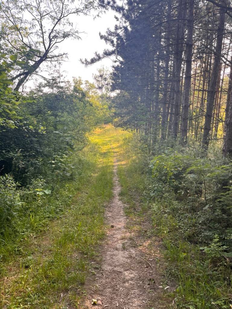Dann Szenenwechsel. Ich denke, es muss sich um einen Irrtum handeln. Die nächsten 3,5km führen mich durch kniehohes Walddickicht mit ganz viel Spinnweben. Ein Blick ins Handy: Der Weg ist richtig und ohne Alternative. Also entwickele ich eine neue Gangart: Über den linken Arm wischen, dann über den rechten, dann durchs Gesicht, nur im Notfall über die Beine. Irgendwann lass ich das. Ich stelle mir einfach vor, ich bin im Dschungelcamp. Ich reiße die Mücken aus ihrem Schlaf, die sich mit Verfolgung und Stichen revanchieren. Am Ende der Etappe finde ich neben zwei Zecken weitere Tiere an meinem Körper, die ich noch nie gesehen habe.