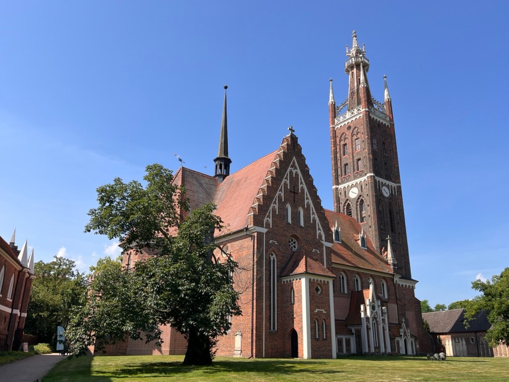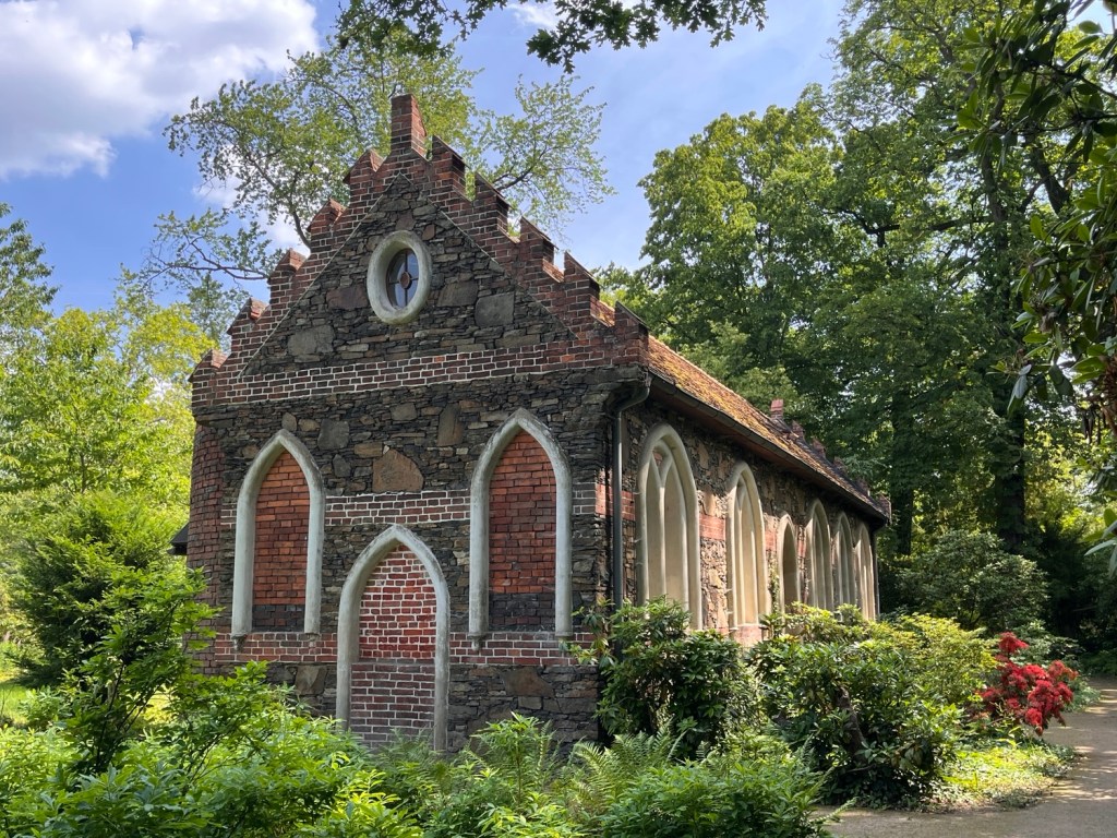 Als ich Wittenberg um 9 Uhr verlasse, sind schon 25 Grad. Puh. Mein Ziel für heute: Gartenreich Wörlitz. Steht seit ewigen Zeiten auf meinem Zettel, jetzt ist es endlich dran. Ich staune schon, als ich die Kirche sehe.