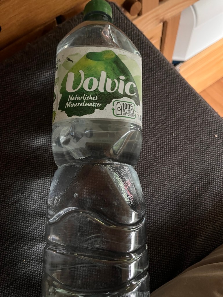 Abfahren bringt nichts, ich hab immer noch nichts gegessen und müsste mindestens eine Stunde fahren. Mir fällt eine Volvicflasche ein, die ich mal für alle Fälle im Bulli verstaut habe. MHD 06/2023. Ist jetzt auch egal. Hauptsache, ich komme morgen um den See.