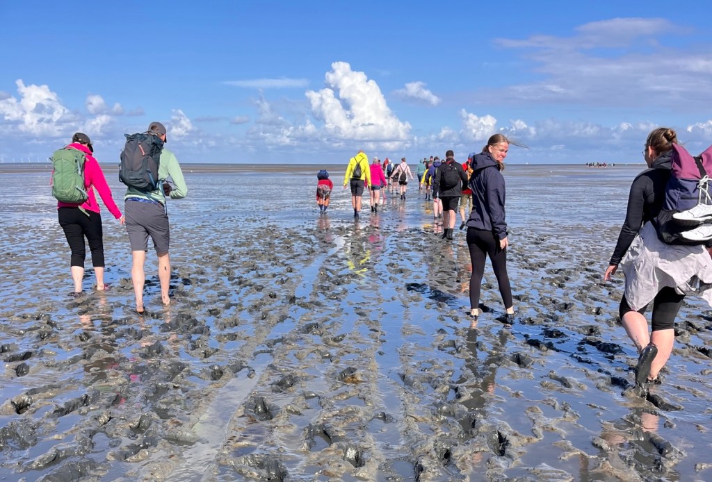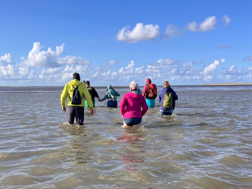 Apropos aussteigen… Da ich keine andere Hose mithabe, ziehe ich meine Jeans aus und gehe im Slip. Ja, sieht lustig aus. Oben dicker Hoody mit Tuch, unten fast nackt. Mir egal, weil wenn die Jeans nass ist, bleibt sie nass. Notiz an mich: Nie wieder in Jeans zur Wattwanderung. Und bei Veranstaltungen vorher nochmal kurz in die Bechreibung gucken.