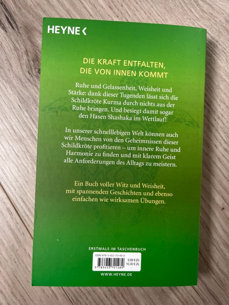 Dieses Buch handelt von Kurma. Sie ist Schildkröte und sehr weise. Im Verlaufe des Buches fragen Sie Tiere um Rat und natürlich antwortet Kurma immer weise. Sie hat 7 Geheimnisse, die darf man verraten: Gelassenheit, Langsamkeit, Beständigkeit, Wandlungsfähigkeit, Genügsamkeit, Friedfertigkeit und Sammlung (merkwürdiges Wort… es meint die Kunst, bei sich zu sein.)