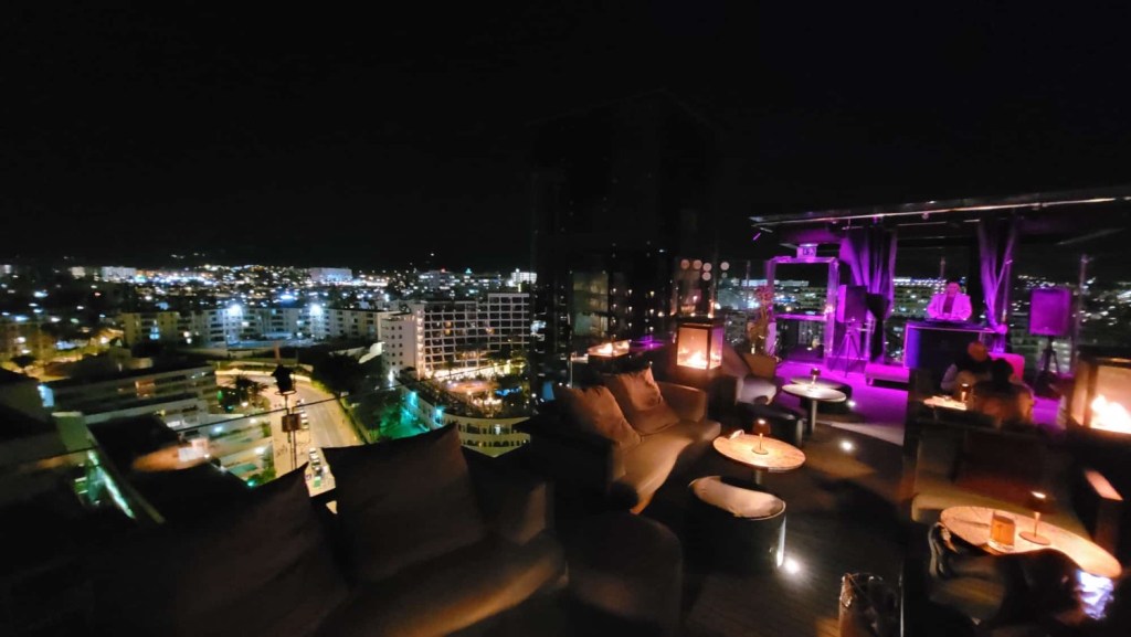Die Welt ist ein Dorf und glaubt es oder nicht, Freund und Exkollege Stephan aus Hamburg, schon mehrfach hier in diesem Blog aufgetaucht, ist heute auf Gran Canaria gelandet und wohnt 12 Autominuten von mir entfernt. Grund genug für einen Barbesuch. Und so sieht mich Playa del Ingles ein zweites Mal an diesem Tag. Statt abgeranzter Touribar am Strand fahren wir „ganz nach oben“. 360 Grad, Rooftopbar.