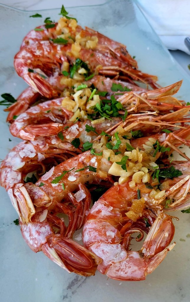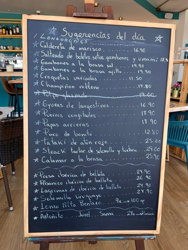 Wir bestellen Gambas und Iberico, nachdem ChatGPT uns die Kreidetafel per Foto übersetzt hat. Mein Spanisch reicht für Bitte, Danke und Bier. Nicht für Knoblauch, Oktopus und Steinpilze.