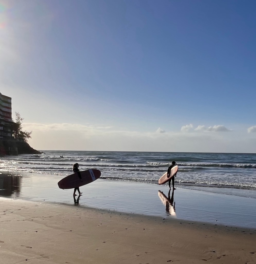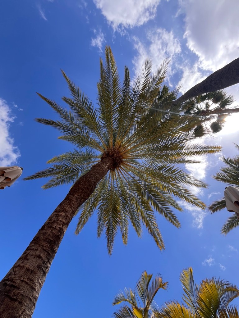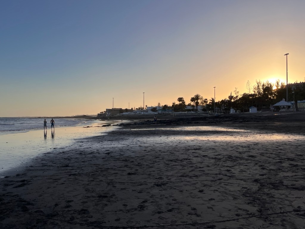 Wenn man morgens überhaupt aufwacht :-), gesund ist, die Sonne scheint, ich draußen frühstücken kann, dieses Frühstück jemand für mich zubereitet hat, ich die Sonne Spaniens in den frischen Orangen schmecken kann, der Kaffee herrlich duftet, das Türkis des Pools meditativ auf meiner Netzhaut liegt, ein leichter Wind über meine Haut streift, es ruhig ist, das Meer vor meiner Zimmertür liegt, es meine Füße umspült, die Surfer im Gegenlicht Wellen reiten, ich keine Termine habe, mich von meiner Lust treiben lassen kann und nicht von meiner To-Do-Liste.